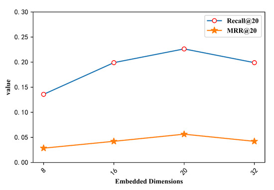Figure 3 shows the effect of the size of the embedded dimension on the performance of the proposed model in the item embedding process. From the experimental results in the Figure 3, it can be seen that when the embedding dimension is 8 dimensions, the embedded representation of the item does not reach the best, and the recommendation performance of the trained model is relatively low. Meanwhile, the main evaluation index Recall@20 is worse than the 16-dimensional result. When the embedding dimensions are 16 and 32, the two index values corresponding to the two dimensions are almost equal, and the performance of the model is improved compared to the 8-dimensional index value, but this does not mean that the higher the dimension is, the better the recommendation performance of the model is. When the dimension is 20, the performance of the model reaches the highest value relative to other dimensions on the two indicators, and the recommendation performance is relatively good.