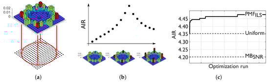 Steps and convergence of Algorithm 1. (a) Symbols are selected according to their amplitude, picking out the four red “symbols” marked in the PMF diagram. (b) A line seach is performed by altering the probability of occurrence of the selected symbols. (c) After iteration over the amplitudes, the algorithm eventually converges on a PMF denoted PMFILS.