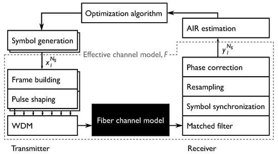 The channel model, F, maps from a transmitted sequence, , to a received sequence, , under stochastic influences. The algorithm is agnostic to the exact process of the mapping of F and the universal nature of this algorithm stems from this invariance to channel models and modulation formats. For the purposes of this work, a SSFM model and QAM constellation formats are used for all optimizations. In Section 4, where three distinct transmission scenarios are considered, only the definition of the channel model, F, changes; definitions are given in the respective sections.