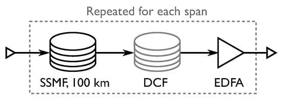 Link setup for the dispersion-managed channel. In the simulations, dispersion management is simulated using ideal filtering.
