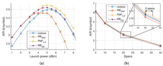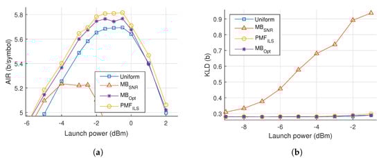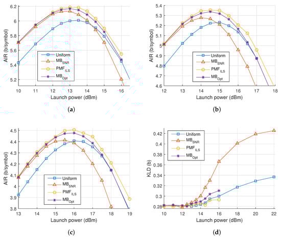 In Figure 8a–c, the AIR of the simulated signals can be seen as the launch power is varied over three distances. A maximum shaping gain of 0.2 bits/symbol is obtained at 160 km, with the shaping gain being >0.1 bits/symbol at all distances.
