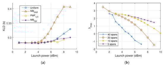 (a) Kullback-Leibler divergence (KLD) versus power for 20 spans of dispersion-managed 256 QAM transmission. (b) of MBOpt versus power for various number of spans.