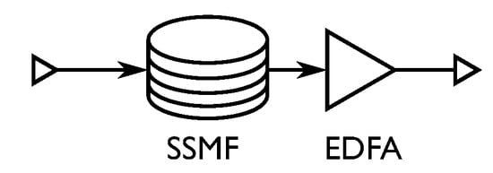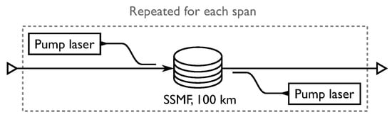 For raman amplification, a co-propagating laser amplifies the data signal through the process of stimulated Raman scattering, with a setup similar to Figure 10. The Raman model used for the simulations is an IDRA where the signal power is constant with distributed noise contributions as in Reference []. Thus the two pumps in Figure 10 are not part of the simulation; instead, the fiber loss, , is set to zero, thereby removing the loss term from Equation (4).
