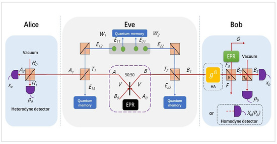 Eve’s Einstein–Podolsky–Rosen (EPR) state is created by two single-mode squeezed states, and with