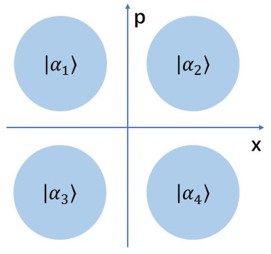 For the four-state protocol, we only prepare four coherent states at phase space (see the Figure 2) [12], namely, here we have , , and is a positive parameter and relates to the modulation variance with .