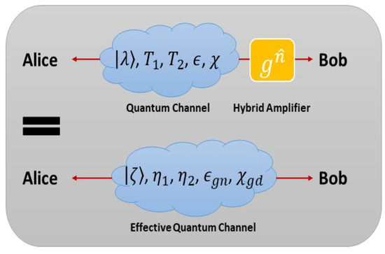 In this proposed scheme, we take the GG02 protocol [2] (the GG02 protocol is a fundamental CVQKD protocol) as usual but add a hybrid amplifier at Bob side, so that the secure key rate should depend on the covariance matrix with presence of the hybrid amplifier. However, the output of the linear hybrid amplifier remains in the Gaussian regime, therefore we use an equivalent channel to replace the previous one (Figure 3). Here, the corresponding system parameters are changed from () to (), those equivalent parameters are listed below,