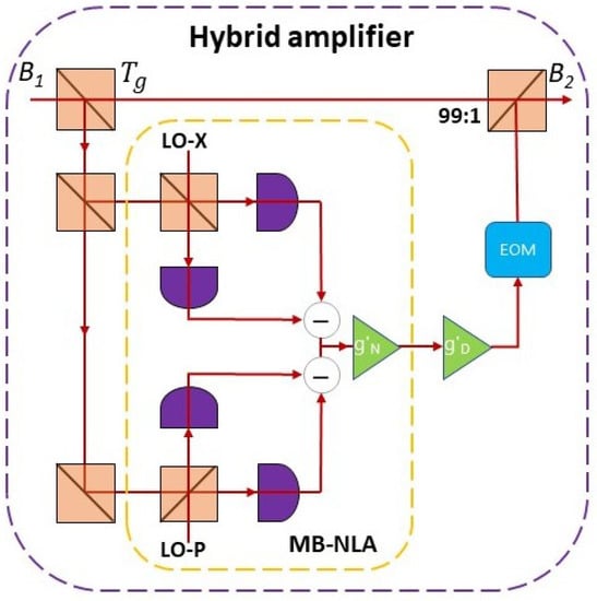 The penalty noise caused by detector in Bob side will also directly affect the transmission distance performance of CVQKD protocol where the entanglement source is untrusted. In practice, the intrinsic disadvantage of the receiver’s apparatus, such as the efficiency of detector and the electrical noise referred by measurement, will decrease the secret key rate and thus shorten the transmission distance. In fact, optical amplifiers can solve such problem, for instance, the noiseless linear amplifier (NLA) is one of existing methods to overcome this limitation of detector. It can compensate the noise penalty and thus preserve the signal-to-noise ratio (SNR) [17,18,19,20,21]. However, the CVQKD scheme with non-traditional light source modulation and non-Gaussian operation, such as the discrete or unimensional modulation and photon subtraction operation, cannot directly implement via NLA. To overcome this problem, the measurement-based NLA (MB-NLA) has been proposed [22,23], which installs a dual homodyne detection ahead of NLA. The MB-NLA not only solve the application problem of NLA in CVQKD shceme with non-Gaussian modulation, but also can simulate the action of post-selection with amplifier. Furthermore, the quantum filter induced by the MB-NLA can simply model an appropriate postprocessing [24,25]. Although MB-NLA has the advantages mentioned above, its property of post-selective restricts it in point-to-pint application such as CVQKD. To overcome this defect, the hybrid amplifier has been proposed, which concatenates a deterministic liner amplifier (DLA) behind the MB-NLA to form a feed-forward loop [25]. Due to the installation of the DLA, the amplification function uncertainty caused by NLA has been solved [24]. Furthermore, the DLA also can compensate the degeneration of SNR caused by NLA. It is worth noting that DLA can be divided into a phase-sensitive amplifier (PSA) and phase-insensitive amplifier (PIA) [26,27]. If Bob adopts heterodyne measurement, we only can deploy PIA as the DLA, on the contrary, it can deploy PSA [28,29].