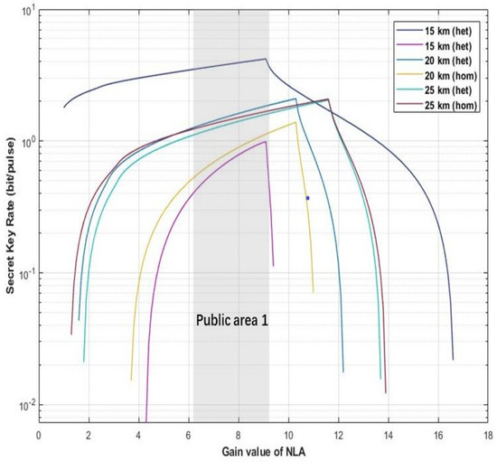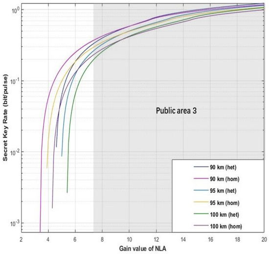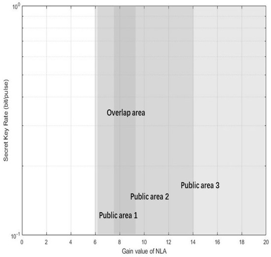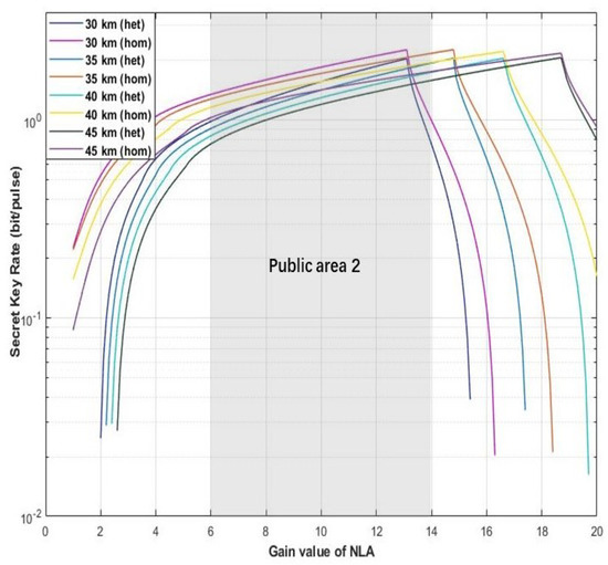 In the second scenario, we have different distance values with d = 30 km, d = 35 km, d = 40 km, and d = 45 km. The public zone 2 has been highlighted with light gray in Figure 6, which represents our proposed schemes can obtain relative higher secret key rate in this gain range with NLA .