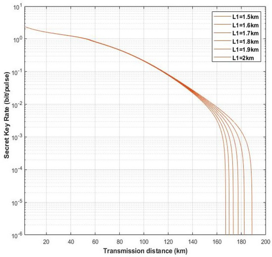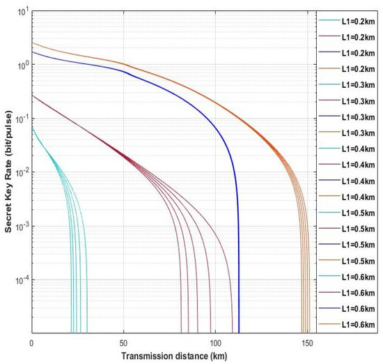 Moreover, we find that the distance between Alice and Eve () can also influence the performance of our scheme. In Figure 9, here we set different distances, , to observe the schemes performance with = 0.2 km, = 0.3 km, = 0.4 km, = 0.5 km, and = 0.6 km. The fixed parameters are set with , , , , and . As shown in Figure 9, the light blue solid lines and red solid lines represent four-state discrete modulation with untested source via heterodyne detection and homodyne detection, respectively. Furthermore, the dark blue solid lines and orange solid lines denote four-state discrete modulation with untested source via hybrid amplifier by heterodyne and homodyne detection, respectively. We can find that with the increasing of the maximum transmission distance of all schemes is increasing, and the increasing of scheme with four-state untested source via homodyne detection is the most obvious, which is almost catching up the scheme with four-state untested source by hybrid amplifier via heterodyne detection. However, when the distance exceeds 0.6 ( > 0.6 km), the four-state with untested source schemes are on longer to generate the secret key rate, and it has the same situation with the counterpart schemes of hybrid amplifier in > 50 km and > 2 km, respectively (as shown in Figure 10 and Figure 11). Therefore, in our scheme we set the distance between Alice and Eve with .