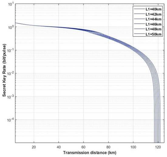 In the final scenario, the distance value are given as d = 90 km, d = 95 km, and d = 100 km. Our proposed scheme can reach the relative higher secret key rate in the public zone 3, which has been shown in Figure 7 with the gain value range .