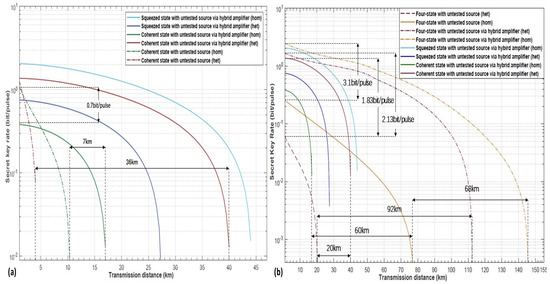 Based on the calculation process in the previous section, we show the performances of various protocols over the lossy quantum channel. According to different modulation methods, we divide these protocols into two categories that includes the protocol based on Gaussian modulation and discrete modulation. For these schemes, we set the entanglement source in untested side, and implement a hybrid amplifier at Bob side. In the case of Gaussian modulation we have the squeezed-state with homodyne and heterodyne detection, or, equivalently, coherent-state with homodyne and heterodyne detection (in Figure 12a). In the scenario of discrete modulation, we select coherent-state with homodyne and heterodyne detection (in Figure 12b). The dashed lines (in Figure 12a) indicate the scheme without hybrid amplifier, and the solid lines denote the scheme implemented hybrid amplifier. Where the red dashed line indicates that the scheme by coherent state with untested source and heterodyne detection is far behind its corresponding scheme with hybrid amplifier, and the red solid line, in terms of transmission distance by 36 km. Furthermore, although the scheme of coherent sate with untested source via hybrid amplifier homodyne detection (the green solid line) has lower initial secret key rate than its counterpart (the green dashed line), its transmission distance has been increased 7 km compared to the same scheme without hybrid amplifier (the green dashed line). The squeezed sate with untested source via hybrid amplifier schemes are indicated as a dark blue solid line and light blue solid line, respectively; here, the scheme with homodyne detection (the light blue solid line) reaches the maximal transmission distance of approximately 45 km, and the scheme of heterodyne detection (the dark blue solid line) reaches it in 17 km. Therefore, in the case of the scheme adopting traditional Gaussian modulation, the hybrid amplifier is helpful in improving the transmission distance indeed.