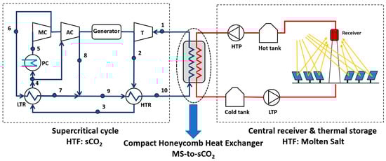 Scheme of the complete STPP (Solar Thermal Power Plants) with the CHHE (Compact Honeycomb Heat Exchanger) between the solar field and the sCO2 cycle.