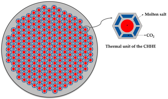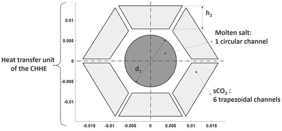 Figure 4 represents a thermal unit of the CHHE accounting for the dimensions. Regarding the geometric parameters of the heat transfer unit, the MS channel diameter (d1 in Figure 4) has been set to 0.5 inch (12.7 mm), whereas the CO2 trapezoidal channel width (h2 in Figure 4) has been set to 5.7 mm. The trapezoidal shape of the duct cross section has been chosen because of geometric reasons, since in this way it is easy to form a thermal unit with a hexagonal shape whose repetition allows creating a honeycomb-like structure. The MS channel diameter is the minimum value reported in [23], that ensures the salt flow without clogging; and the CO2 channel dimensions have been selected to avoid a great pressure drop without penalizing the heat transfer due to a lower CO2 velocity. The pressure drop in the source heat exchanger of a STPP ranges from 2 to 3 bar, depending on the daily operation hours; this a greater value than that of baseload plants [24], that can operate continuously.