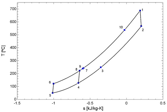 Figure 3 shows the temperature-entropy diagram of this supercritical cycle. As it can be seen, this cycle is characterized by two compressors (processes 5, 6 and 4–8) and two recuperators, for low and high temperature (LTR and HTR, respectively). The source heat exchanger is characterized by process 10–1.