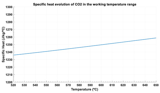 From Figure 5, it is concluded that temperature evolution is almost lineal for both streams, which means that specific heat is nearly constant. This is clear for the molten salt, which is an incompressible fluid approximately, but also for the supercritical CO2, as this fluid is at very high temperature and far away from the critical point. Figure 6 shows that specific heat ranges from 1.236 kJ/kg/°C to 1.258 kJ/kg/°C in the working temperature values (from 520 °C to 650 °C).