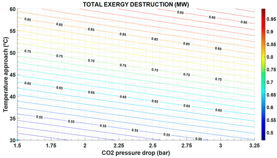 Exergy destruction in the CHHE, as function of the temperature approach between MS and CO2, and the CO2 pressure drop.