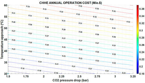 CHHE annual operation cost, as function of the temperature approach between MS and CO2, and the CO2 pressure drop.