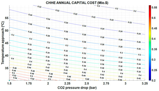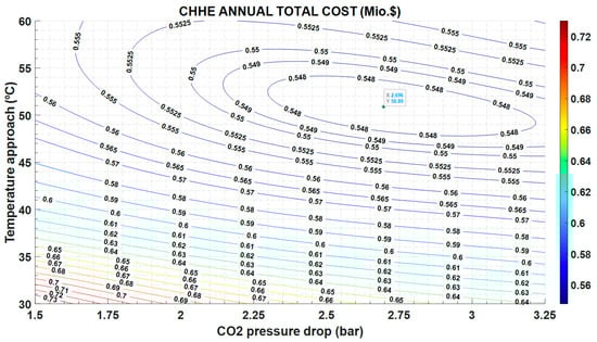 As said in Section 2, the optimization procedure to minimize the objective function Annual Total Cost (Mio.$) is done on the following parametrized thermal inputs: the temperature approach (TAMS-CO2) between both streams, and the pressure drop of the supercritical phase (dPCO2). TAMS-CO2 ranges from 30 °C to 60 °C, whereas dPCO2 ranges from 1.5 bar to 3.25 bar. These two parameters (pressure drop and temperature approach) have been considered in several optimization studies of heat exchangers, as they affect both the investment and the operation costs [33,34].