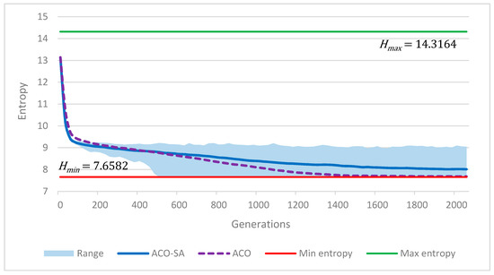 The development of entropy during optimization in case of instance gr202 is shown in Figure 4; the minimum and maximum limits of entropy are also emphasized. The blue curve is the averaged value computed from 60 optimization trials using the ACO-SA algorithm, the light blue area represents the range of entropy in these 60 trials. At the beginning, the entropy is close to its maximum limit, then it drops fast to the point where it decreases almost linearly towards its minimum limit. Indeed, a value of entropy close to the minimum limit is reached in some cases; and in some of them, this minimum entropy was reached at somewhere around the 500th generation, which is about one quarter of optimization. The dashed violet curve shows the same task but this time using the ACO algorithm for optimization (i.e., without simulated annealing). It is clear that the diversity of the population drops faster in this case. Thus, the simulated annealing also contributes to maintaining the diversity of the population.