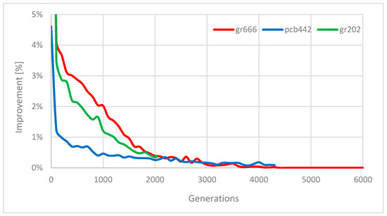 The average improvements of the best solution in dependence on a current generation for instances gr666 (), pcb442 (), and gr202 () are shown in Figure 5. The improvement is high in the first phases of the optimization (it is higher than 20% in the first generations for instances gr202 and gr666), the effect of which is the fast convergence. Then, the improvement decreases at different speeds for individual instances. In case of instances gr202 and pcb442, the improvement is non-zero during the entire optimization. In the case of instance gr666, it is zero in the last third of the optimization (note the purpose of parameter ; for this reason, in case of instance gr666, this parameter was set to in order to save the execution time). In general, the behavior of simulated annealing varies for each instance to be solved.