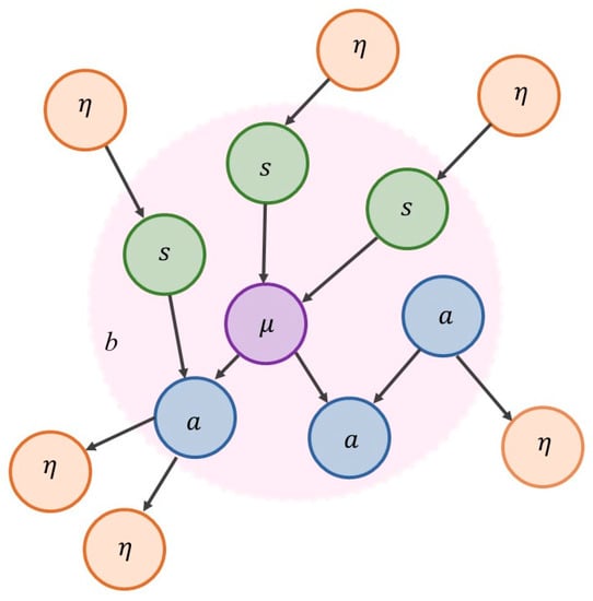 A typical generative model is depicted in Figure 3. Here, hidden states (η) correspond to the external states that are hidden from the internal states behind the Markov blanket. The crucial thing to appreciate is that beliefs about hidden states correspond to a hypothesis—that the organism embodies—about the causes of its sensations. These hidden states arguably have all the properties that would make them the content of structural representations [8,31,32,34,35,56,93]. The hidden states of the generative model are parameterized by the internal states of the system (e.g., the brain) and encode exploitable information about external states that guide adaptive behavior. We will return to this point later.