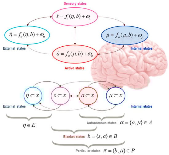 Markov blankets of life. This figure depicts a Markov blanket around a system of interest; here, the brain. The figure associates the Markovian partition to internal (μ), blanket (b), and external states (η); where blanket states can be active (a) or sensory (s) states, depending on their statistical relations to internal and external states. Here, the flow of each kind of state (denoted with a dot) is expressed as a function of other states in the partition (plus some random noise, denoted ω), as a function of the independences that are harnessed by the Markov blanket. Autonomous states (α) are those that follow a free-energy gradient. Particular states (here, denoted π) are those identified with the system itself (internal and blanket states).