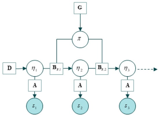A generative model. Here, sensory states are observed outcomes, denoted s. The generative model represents external states as hidden states, denoted η. Depicted in this schema are the likelihood mapping from hidden states (denoted A), prior beliefs about the probability of state transitions (B), and the prior beliefs about initial (hidden) states (D). The G term is an expected free-energy that drives policy selection (π) in elaborated generative models that entail the consequences of action (not shown here). The form of this generative model assumes discrete states and steps in time shown from the left to the right. This kind of generative model is known as a hidden Markov model or partially observed Markov decision process.