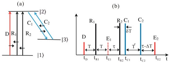To fix the absorptive echo problem in DR, the CDR echo protocol was proposed, whereby the control pulse pair C1 and C2 were added, as shown in Figure 1b []. As discussed in references [,,,,], the function of the control pulses is not only to convert the coherence between optical and spin states via population transfer, but also to induce a collective phase shift. Unlike the DR scheme of Equation (8), the propagation vector of E2 can be controlled to be backward if : [,]. Here, the rephasing pulses had nothing to do with the phase matching for . Unlike the forward echo in the conventional two-pulse photon echo scheme, which suffers from reabsorption by noninteracting atoms, according to Beer’s law, the backward echo E2 is free from reabsorption, resulting in near-perfect echo efficiency [,,]. To eliminate any potential two-photon coherence between states , the C1 pulse was delayed by δT from R1. Here, it should be noted that the macroscopic two-photon coherence was sustained only within the overall optical coherence time determined by the inverse of the atom broadening . However, individual atom coherence was sustained regardless of atom broadening for the optical phase decay time T2, where []. Here, the D pulse duration was practically comparable to (or a bit longer than) . Thus, by simply neglecting , the atomic coherence at can be expressed as: