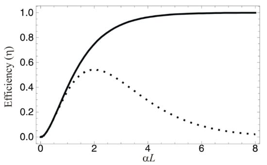 In Figure 2, we plot the echo efficiency of both the forward (dotted) and backward (solid) echo schemes for Figure 1. For the forward echo, the retrieval efficiency reaches 54% at maximum and then exponentially decreases due to the reabsorption process. On the other hand, the echo efficiency for the backward scheme approaches unity for αL ≫ 0, as expected, according to reference [] and as demonstrated in reference [].