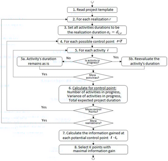 In this paper, an information-theoretic approach is proposed for identifying potentially good project inspection points. The objective of the inspection is to better estimate a project’s overall duration by a given number of inspection points. Accordingly, the proposed approach measures the expected information gain about the estimated project duration at each potential inspection point and selects the most informative inspection points. Previous studies that also aimed to obtain informative monitoring points considered, for example, some simplifying assumptions regarding project activities [], partially related heuristics taken from electromagnetism theory [], and an intensity measure of the activities as an indirect indication of the anticipated information gain []. Other practical approaches did not use a clear mathematical formulation to address the monitoring optimization problem and instead proposed locating the inspection points by practical rule-of-thumb measures, such as the ‘number of activities in progress’ or ‘total variance of ongoing activities’. These methods were shown to result in non-optimized inspection points in terms of their expected information gain. Moreover, we show by just a few examples that popular rule-of-thumb practices can result in non-informative outcomes, such as locating the monitoring points at times with many activities running in parallel, where the information gathered provides (at that point) a poor estimation of the overall project’s duration, e.g., there is a high probability that, even if almost all activities are progressing as expected at that time, one or more activities will be delayed later, causing the overall project duration to be extended. In any case, none of the above methods applied a straightforward, systematic, information-theoretic approach to the project plan as proposed herein.