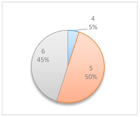 Figure 10 and Figure 11 compare the results of the original project to those of the underestimated project. The two figures clearly show that the model has readjusted the selected monitoring points and the potential information gain as a result of the realizations, which show that the project manager initially underestimated the activities’ durations. The box plot graphs and the pie charts are drastically changed from those of the original project. Based on the original project estimations, the monitoring points should have been located at or However, when using the underestimated project times, the selected points change, and while and are still found to be relevant in some of the scenarios, new time points such as , and are now added as potential inspection points.