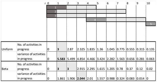 Raz and Erel [], as well as Tareghian and Salari [], presented an analytical framework for determining the timing of project control based on maximizing the total amount of information generated by the monitoring points. In particular, Raz and Erel [] presented an analytical framework for determining the timing of control points, such that to maximize the number and the intensity of the activities that are taking place at that time point. The authors developed an optimal solution procedure based on dynamic programming and a typical s-curve that, for a given number of control points, determines the timing of each control point. Tareghian and Salari [] proposed a model that first identifies the optimum number of control points and then determines the timing of the points based on the information gathered at each control point using attraction-repulsion mechanisms borrowed from electromagnetism theory. The benefit yielded by the gathered information is then calculated based on the variance of the beta distribution, which is also used in this study. Note that both aforementioned studies relied on simple heuristics to estimate the gathered information rather than using a more precise information theory measure, as done in this study.