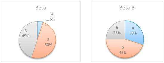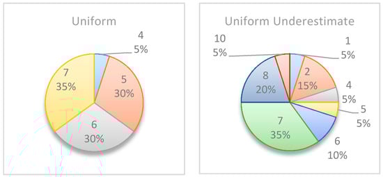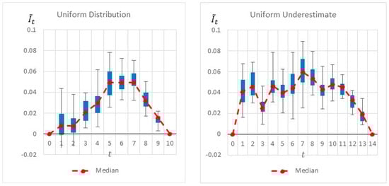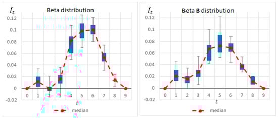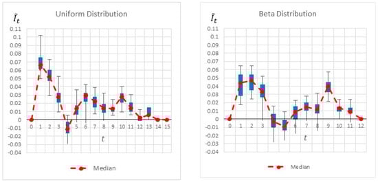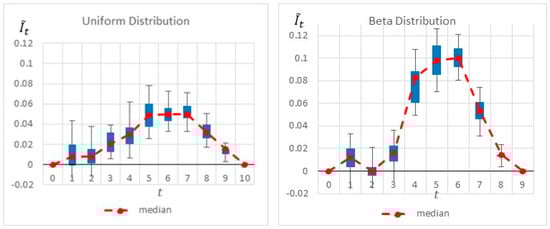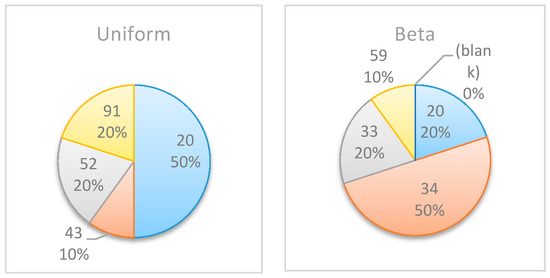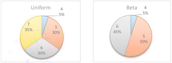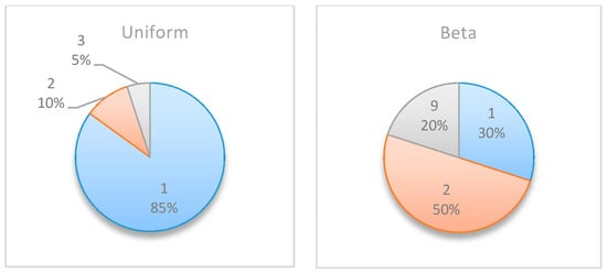 Figure 6 summarizes by box plot graphs the results of all simulations for both the uniform and beta distributions. The graphs show the amount of information gained, , at each potential inspection point . Figure 7 shows the distribution of the selected monitoring points over 20 simulations. Both figures demonstrate the importance of the “most likely” parameter, provided by the beta distribution, for the expected information gain and the selection of the monitoring points. As shown in the figures, the beta distribution results are more coherent in recommending or , whereas the uniform distribution results show an equal preference for inspection points at , or . This is an important outcome that justifies the additional overhead required by both the project manager and the team, enabling defining and maintaining additional information on the “most likely” value instead of merely providing the minimum and maximum values.