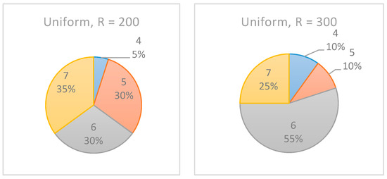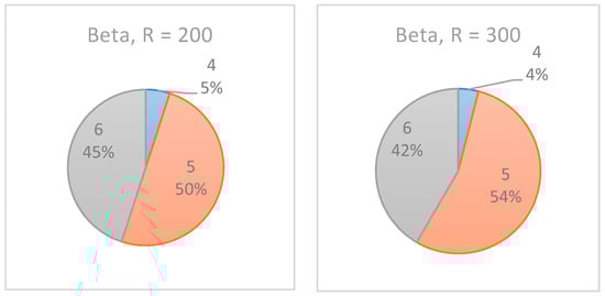 As shown in Figure 12, the increase in the number of realizations affected the results only slightly, such that the confidence level of the recommended monitoring point increased. In the experiments with R = 200, the algorithm equally indicated as the selected inspection point. However, when was increased to 300 realizations, in 55% of the cases, was indicated as the preferred inspection point. Note, however, that for the beta distribution (see Figure 13), the same increase in the number of realizations had almost no effect on the results.