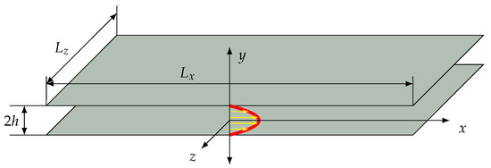The channel geometry is formally infinitely extended, yet in the numerical representation it is given by its extent as in Figure 1, with stationary walls at and periodic boundary conditions in x and z.
