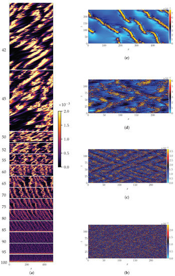 evaluated at an arbitrary value of z (here ). The space variable is expressed in a frame moving in the streamwise direction with the mean bulk velocity for that particular value of . Since is lowered over the course of time, this allows one to capture the different flow regimes preceding full relaminarization. The intensity of turbulence, measured here by the value of , is seen to gradually increase as is lowered. At high , the so-called featureless turbulence occupies the full domain, as shown in Figure 2b at using isocontours of . As is lowered, turbulence self-organizes into the recognizable pattern regime [17] shown in Figure 2c for . As is further reduced the turbulent zones become sparser (see Figure 2d for ). The spatially localized turbulent regions emerge as narrow stripes throughout the process of decreasing while the gaps between them constantly increase in size. The emerging patterns never feature an array of strictly parallel stripes like in former computational approaches [19,31,41], instead they feature competing orientations as in pCf [4], see Figure 2b–d. In this regime the pattern travels with a streamwise convection velocity slightly slower than . Within the quasi-laminar gaps, reaches very low values, at least an order of magnitude less than in the core of the turbulent stripes. The lower , the lower these values. Below the stripe pattern eventually breaks up to form independent turbulent bands of finite length, all parallel to each other [34], as shown in Figure 2e for . The new resulting pattern as a whole shows negligible spanwise advection, while it propagates in x with a velocity close to [42]. The independent turbulent bands show enhanced motility in both directions x and z. This motion relative to the frame of reference causes the tilt of the stripes seen in Figure 2a for as well as the apparent increase of thickness.