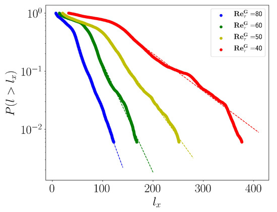 The statistical analysis of the distribution of laminar gaps reveals that the distributions are exponentially tailed over the entire parameter range , demonstrating that even the value remains away from any sort of critical regime, which would be marked by algebraic distributions. This is consistent with the existing estimation of the location of the transitional critical point [18,27], which translates to . The entire patterning regime should thus be seen as bona fide spatio-temporal intermittency, with the critical behavior and transition point being relegated to values of . Exploring the statistics of the flow closer to the critical point would require even larger domains and longer observation times. Such an investigation is outside the scope of the current study.