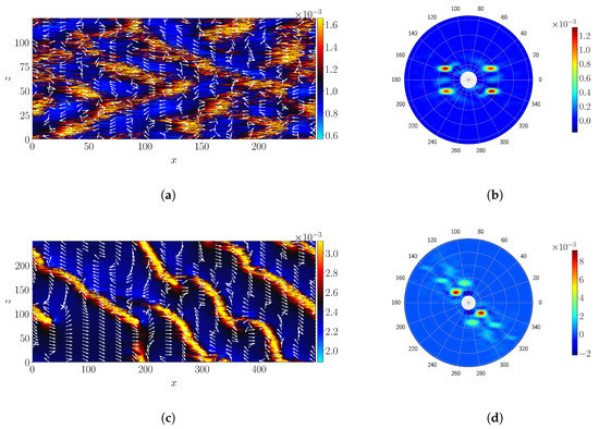 where , with k being the leading non-zero wavenumber identified from the power spectra (excluding the mode). The Fourier spectrum is computed for the quantity , but similar results have been observed for other observables such as and . The angles can be read directly from the Fourier spectra in polar coordinates, see Figure 4b,d for the same values of and 40, respectively. The mean angles and are then computed by respectively space-time-averaging and time averaging the data obtained from Equation (6) and (7).