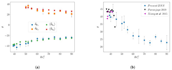 (a) Variation of the mean (signed) angle of the turbulent bands with , computed from the Fourier spectra (, ) and the mean (signed) angle of the local velocity (, ) (b) Variation of the mean unsigned band angle q along with the data from Reference [27,30].