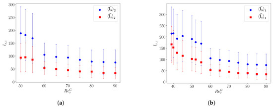 Figure 4c shows that across a band, the local large-scale velocity changes orientation [41]. This property is used to sort out the local maxima of (higher than ) as belonging to one band with a particular inclination. This allows one to define the respective streamwise and spanwise inter-stripe distances and between bands of the same orientation. Figure 6a,b displays for orientations 1 and 2, respectively, as a function of . Both increase when decreasing . They vary in parallel in the patterning regime, hence the quasi-constant angle of the bands. When only one band orientation survives, one observes that the increase in amounts to the saturation of , while keeps increasing.
