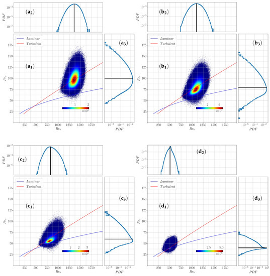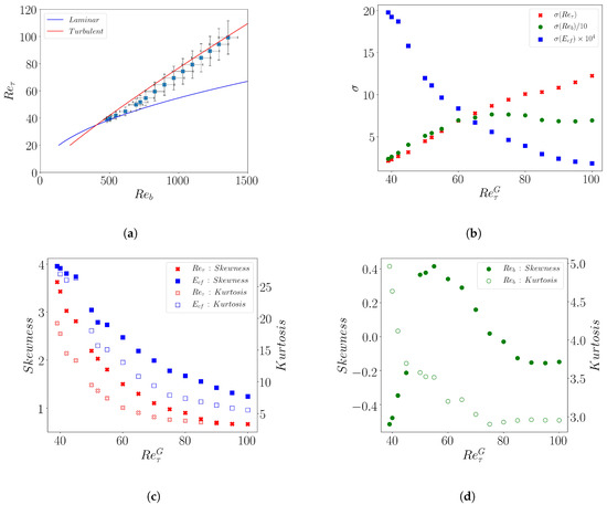 Their mean values of and (Figure 10a) simply follow the trends described above for the most probable value of the distribution, connecting the turbulent and the laminar branch, when decreases. Away from the turbulent and laminar branches is linearly related to , in agreement with the observation of a constant . The standard deviation (Figure 10b) for and decrease together with . This decreasing trend agrees well with the experimental wall shear stress data reported in Reference [29]. The standard deviation for is found to increase with decreasing , matching the trend reported in Reference [34].