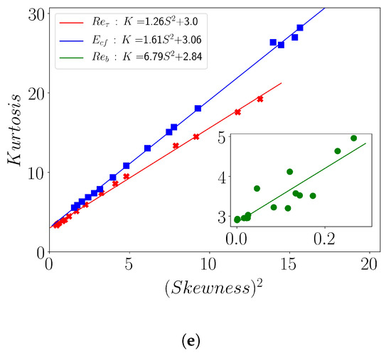 The variation of the 3rd and 4th moments and , i.e., the Skewness (S) and Kurtosis (K), versus for the observable and is shown in Figure 10c. These moments exhibit a strongly increasing trend with reducing for both quantities. This similarity in behavior leads to as shown in Figure 10e. This correlation between the third and fourth statistical moments was first noted in Reference [48] for the fluctuating velocity in turbulent boundary layers at high Reynolds number. In the transitional regime, the same relationship has been found to hold in the experiments of Agrawal et al. [29] from wall shear stress data. We therefore confirm this yet-to-be-understood extension of a high Reynolds number scaling down to the spatio-temporal intermittent regime. Furthermore, we observe that the same scaling also holds for the turbulent kinetic energy (Figure 10e). In contrast it does not apply to (inset of Figure 10e). The reason is that while the Kurtosis follows the same trend as for the two other observables, (Figure 10d), the skewness shows a markedly different behavior: it is non-monotonous, changes sign twice and exhibit a maximum in the core of the spatio-temporal intermittent regime.