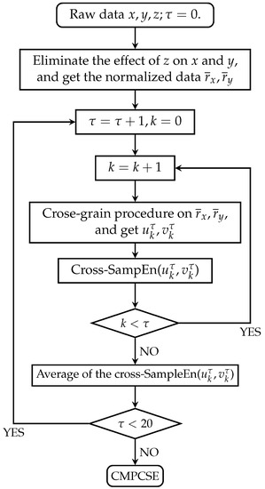 is within the tolerance r. And then represents the total number of m-dimensional matched vector pairs and is obtained from the two k-th coarse-grained time series at a scale factor of . Similarly, is the total number of matches of length . Finally, the CMPCSE is calculated with the equation: