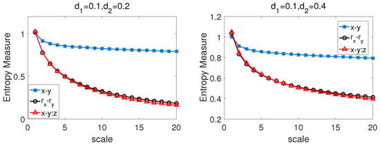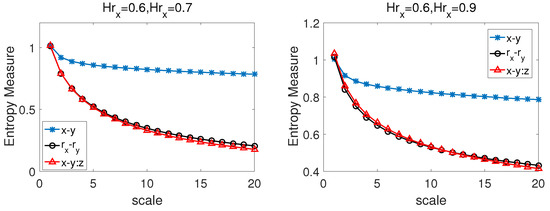 In this subsection, in order to test the performance of CMPCSE, we first use it to calculate the partial cross-sample entropy of BFBMs in the two sets of the above additive models (Equation (9)). The and are the incremental series of the two components of BFBMs with Hurst indices and . Extensive research on BFMS has been made. We know that BFBMs is a single fractal process and there is a relationship [41,42,43]. Wei et al. studied the long-range power cross-correlations between and in 2017 [40]. In the simulations, we set: (left) , , ; (right) ; where is the cross-correlation coefficient between and .
