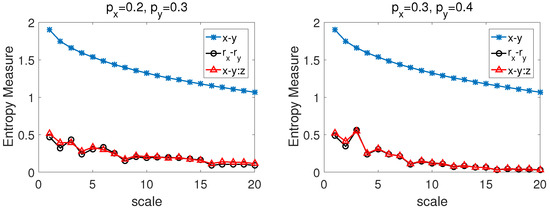 Figure 5 also shows that the entropy values of and are very close at all time scales, but there are obviously discrepancy between the values of and except when the time scale equal 1. It also means that, when are affected by the third party factor z simultaneously, one can use the CMPCSE to get intrinsic cross-sample entropy values of .