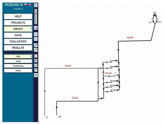 The MOSKAN-W system is a key module of the IT system, which also consists of a GIS and SCADA and Automated Meter Reading (AMR) monitoring and billing systems. Calculation data for the MOSKAN-W system can be loaded from the GIS database and prepared in the form of imported text files or created in an interactive mode. The application calculation kernel is Epanet2 software [9,10] developed by Water Supply and Water Resources Division of the U.S. Environmental Protection Agency—EPA [11]. Hydraulic losses in the network are calculated on the basis of Hazen–Williams, Darcy–Weisbach, or Chezy–Manning calculation formulas. The hydraulic calculations of the network model use the global gradient method [12], which is a modified version of the Newton–Raphson method [13].