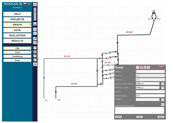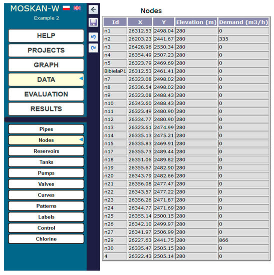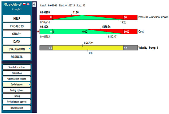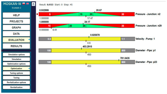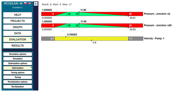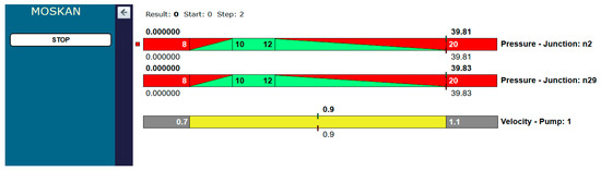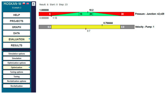 Figure 8 shows the values of quality criteria and the value of the control variable at the beginning of the optimisation process, while Figure 9 shows the final results, when the algorithm found a satisfactory solution after 17 steps of calculation. The values of pressure heads in both the n2 and n29 nodes, in which the water consumption values decreased, are in the ranges of preferred values, and at the same time, the pump speed decreased to 0.76 of the nominal speed.