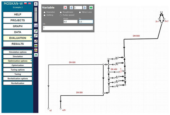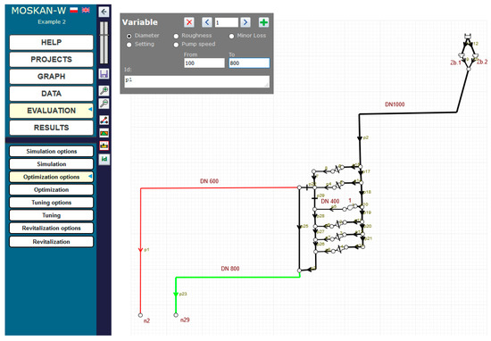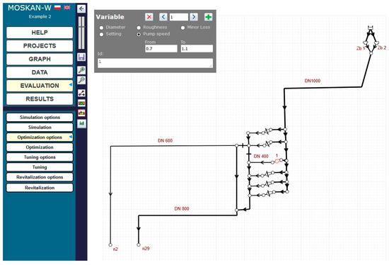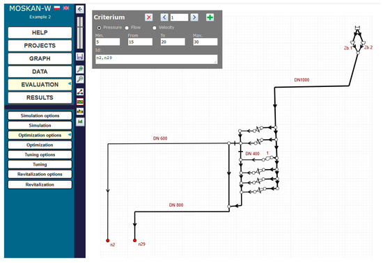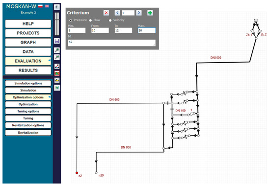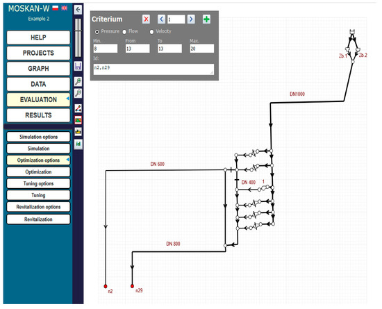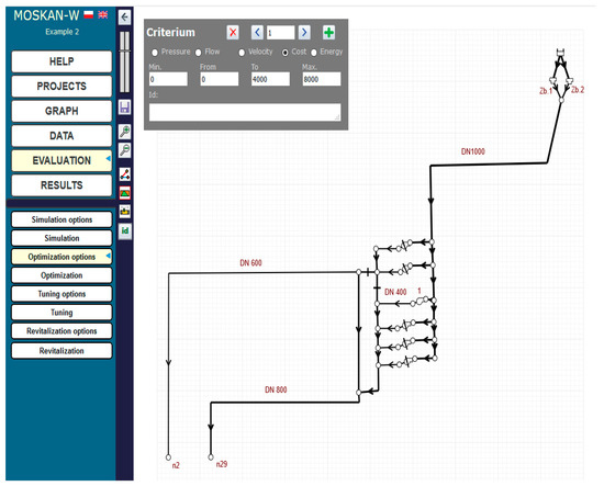 Figure 13 shows the example of defining the quality criterion for node n29. For both nodes n2 and n29, separate criteria are defined, postulating different preferred pressure heads at both nodes, i.e., (15–20) m for n2 and (20–25) m for n29. Figure 14 and Figure 15 show the definition of variability ranges for the decision variables, i.e., for the speed of the pump 1 (values range (0.5–1.1)) and for the diameters of two network pipelines p1 and p23, while for both pipes the same acceptable range of diameter variability (100–800 mm) was determined.