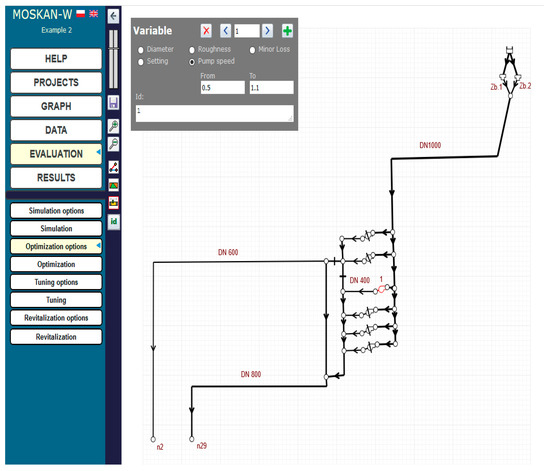 The solution of the problem using the algorithm presented is to define the optimisation option, i.e., to define the quality criteria and control variables. The quality criteria defined in the task are the pressure head values in nodes n2 and n29 at the exit from the pumping station, for which preferred (10–12 m) and permissible (8–20 m pressure head values should be defined (Figure 6). The control variable is the speed of pump 1, for which the speed range (0.7–1.1) should be assumed and for which the solution of the task will be sought (Figure 7).