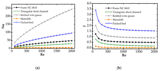 (a) Average Nusselt number and (b) Fanning friction factor for considered catalyst carriers.